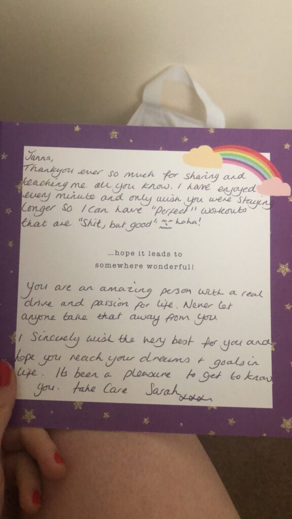 Suunnitelmana oli olla 6kk Englannissa, mutta sisäilmaongelmien tuomien vaikeuksien takia olin vain 2kk. Armeijan alueella olevat talot olivat vanhoja ja rupesin oirehtimaan sisäilman takia todella vakavasti. Harmi, mutta uskon kohtaloon. Uskon, että asiat aina tapahtuvat syystä. Jotain muuta oli tarkoitus tapahtua sen 4kk aikana, jonka olisin viettänyt siellä. Ja niin tapahtuikin, upeita asioita.