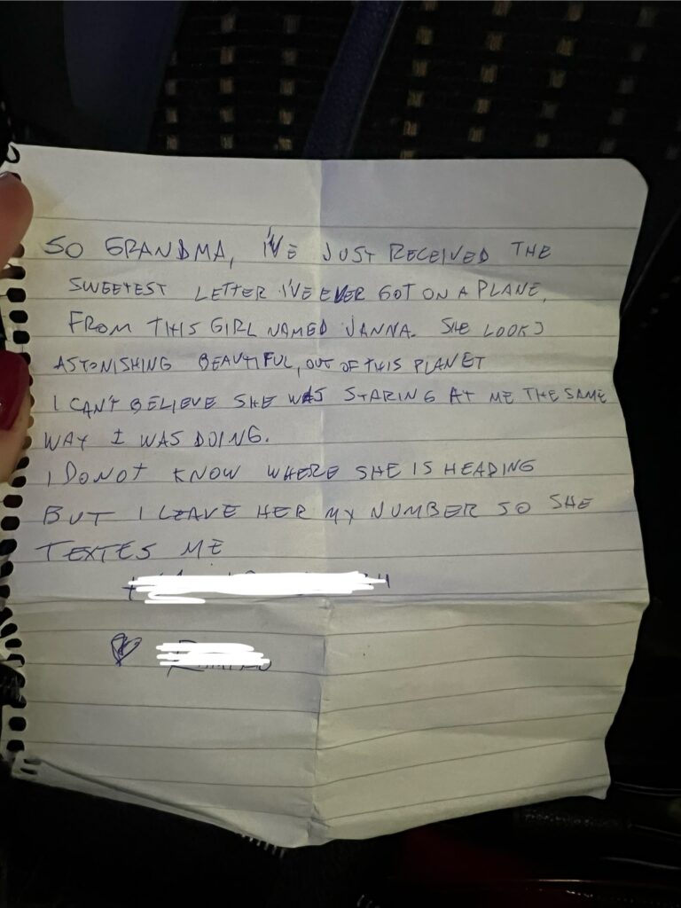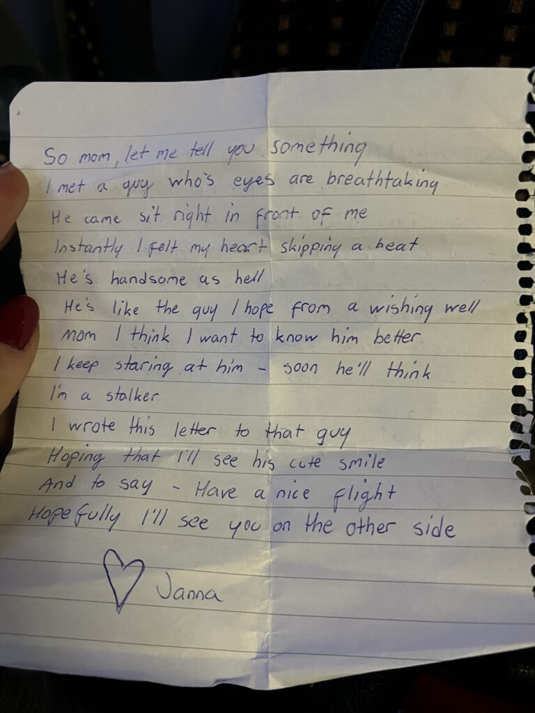 Nousin paikaltani. Aloin kävelemään hänen ohitseen, ”menossa kohti vessaa”. Katsoimme toisiamme silmiin ja hymyilimme, kun olin hänen kohdallaan. Kävellessäni hänen ohitseen tiputin kirjeen hänen syliinsä. Kävelin itsevarmasti koneen päädyssä sijaitsevaan vessaan. Heti oven suljettuani aloin nauramaan ja hihittelemään kuin pikku tyttö. ”Mitä ihmettä juuri tein”, muistan naureskelleen itselleni. Palasin vessasta paikalleni, katsoimme miehen kanssa toisiamme ja hymyilimme. Lopun matkaa lennosta nukuin.